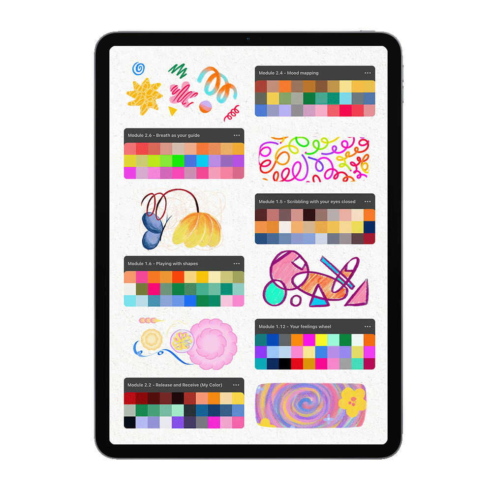22 grounding lectures and 20 soothing Procreate exercises across 5 modules. Created by Freya and guided by Courtney Kim Morgan, a licensed professional clinical counselor and registered art therapist.